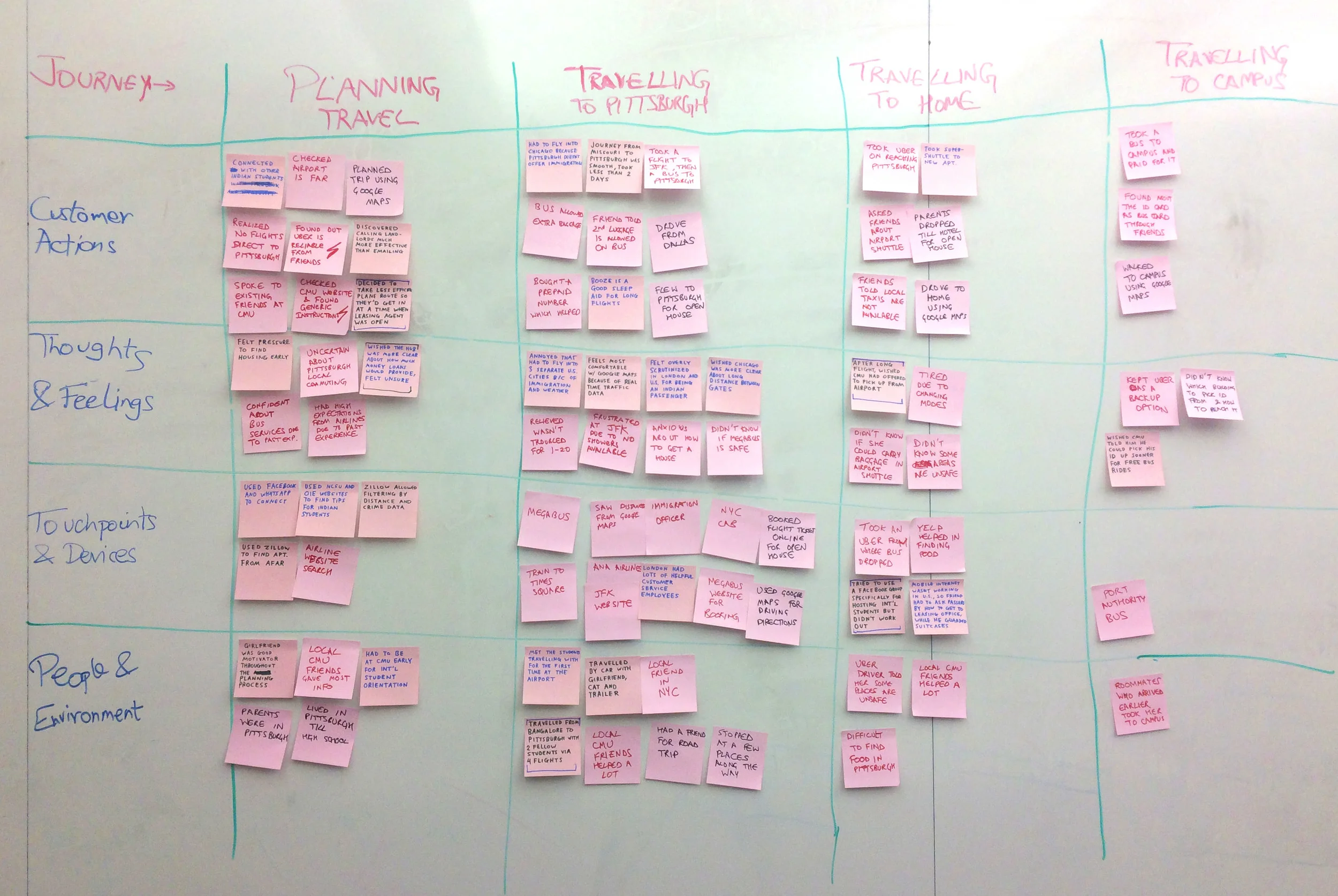 Directed Storytelling: At the start of this project, we collected information from four Carnegie Mellon students who had recently moved to Pittsburgh to uncover the high and low points they experienced when relocating to a new city. We did this through directed storytelling, an interview technique that prompts the user to recount their experiences through open-ended questions. From this, we synthesized our findings by combining our interview notes on sticky notes and finding commonalities across the students' disparate experiences.
