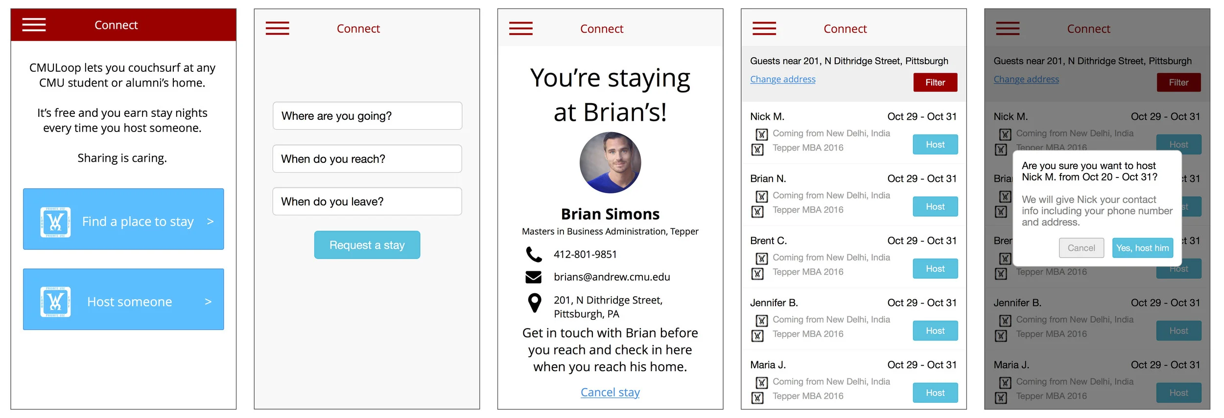 Our user research showed that many new students do not have an apartment arranged before arriving to Pittsburgh, which caused anxiety and stress first thing. We aimed to address this problem by arranging free temporary housing with a current student, which also helps create new friendships throughout CMU.